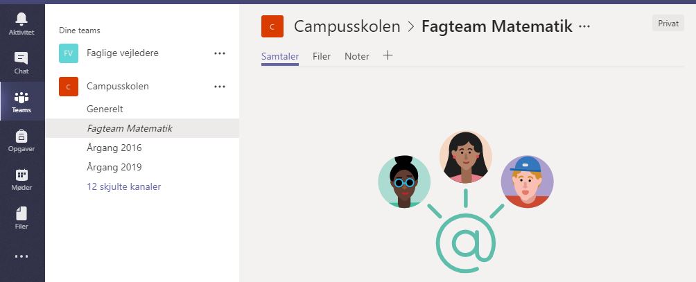 Samtaler er tænkt som et sted, hvor vi kan skrive til hinanden. Det er nok begrænset hvor meget vi kommer til at bruge det, men måske kan det være smart at skrive her, hvis man lægger et vigtigt dokument ind i arkivet, og gerne vil gøre andre opmærksomme på, at det er klart til brug. Skriv gerne en lille hilsen, når du besøger Teams første gang.