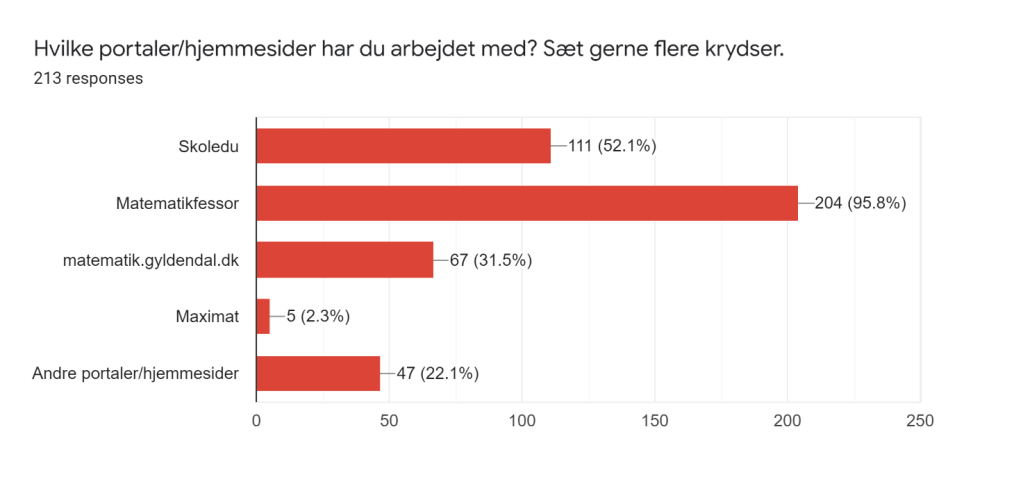Det er tydeligt, at eleverne på 7. årgang har en hel del erfaring med digitalt undervisningsmateriale. Hele 95% af eleverne har arbejdet på Matematikfessor og 52% har erfaringer med Skoledu, som er en af vores vigtigste platforme. Kun31% har arbejdet på Gyldendals portal, som vi også anvender. Her er det gode erfaringer at bygge videre på.