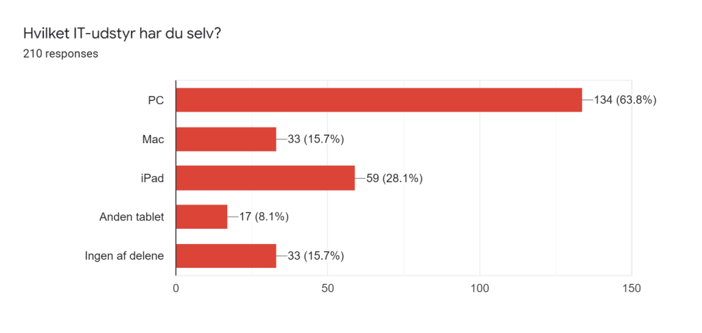 Kun 7,5% af eleverne har ikke adgang til It-udstyr hjemme og 16% har ikke eget digitalt udstyr. Det betyder, at der er basis for bring your own device i ret høj grad. Alligevel svarer 46% af eleverne, at de ikke tager deres egen computer med i skole. Det betyder, at der hos eleverne er en ret stor vognpark af computere, som ikke bruges i skolen. Det kunne skyldes at de er stationære, men det er ikke sikkert, at det er hele forklaringen.