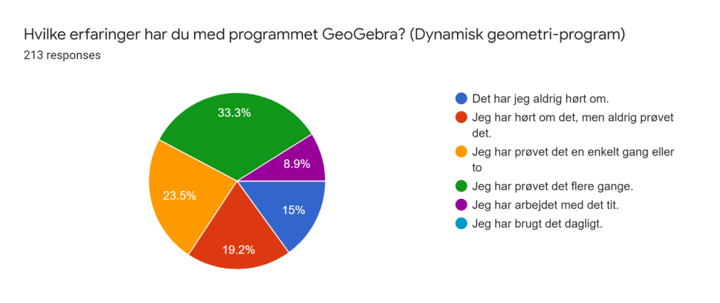 15% af eleverne har aldrig hørt om GeoGebra og hele 58% har enten aldrig brugt det eller kun prøvet at bruge det en enkelt gang. Det betyder, at over halvdelen af eleverne har brug for at starte helt forfra med dynamisk geometri, når de begynder på Campusskolen.