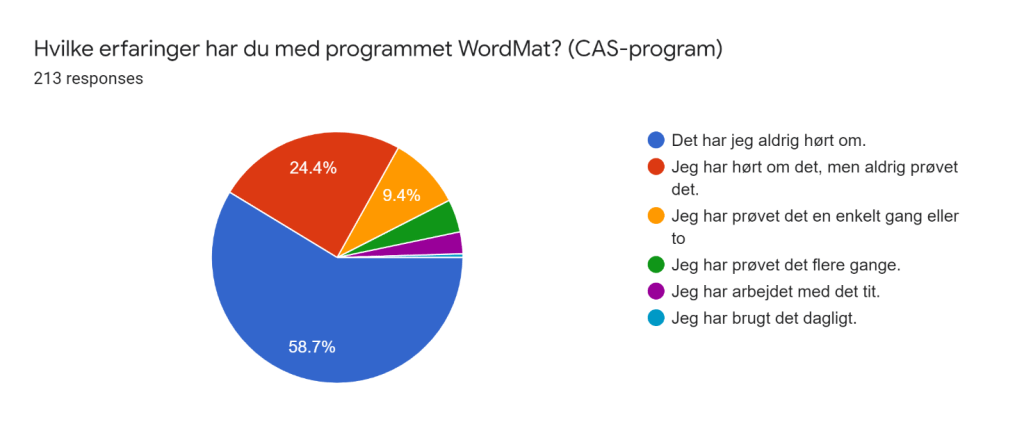 Omkring 7% af eleverne har erfaringer med CAS-programmet WordMat. Det er muligt at eleverne har mødt andre CAS-programmer, da der findes mange programmer tilgængeligt online. Dog angiver kun cirka 30% af eleverne i undersøgelsen, at de har arbejder med andre programmer end de nævnte, og ingen elever nævner en af de andre CAS-programmer. Det betyder, at vi må undervise i brug af CAS-programmer ud fra at eleverne ingen forudsætninger har med sig.