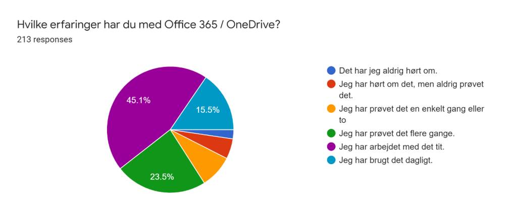 Som noget nyt har jeg spurgt til elevernes erfaringer med Teams og OneDrive, og her er det tydeligt, at eleverne har noget mere erfaring med sig. Kun cirka 20% er på bar bund i forhold til Teams og cirka 60% af eleverne har tit eller dagligt arbejdet med OneDrive. Det er fine forudsætninger at bygge videre på. Jeg kunne godt forestille mig, at fjernundervisning i Corona-lockdown spiller en vigtig rolle her.