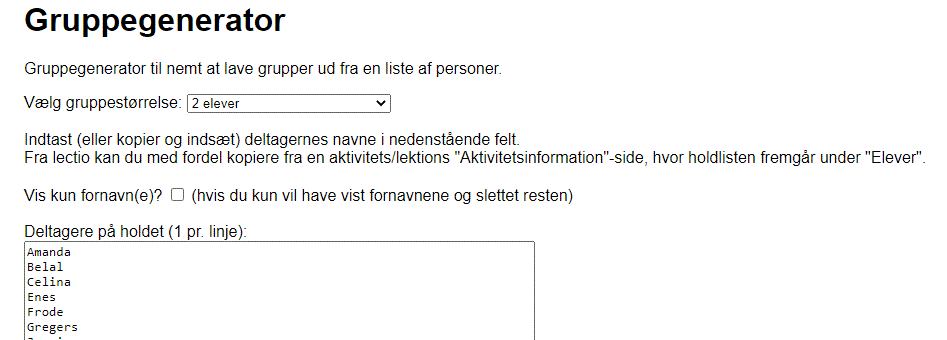 På denne hjemmeside kan du let og hurtigt sammensætte grupper tilfældigt. Du vælger let hvor mange elever, der skal være i grupperne, og overlader fordelingen til programmet. Det er en sjov måde at trække lod på, og eleverne får en tydelig oplevelse af tilfældighed og retfærdighed.